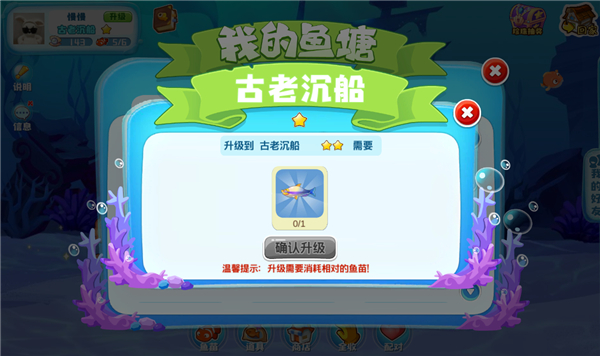 玩家可以通过鱼碎片合成珍稀鱼苗,消耗相对应的珍稀鱼苗可以升级鱼塘。