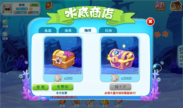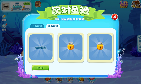 (1)公鱼配对:玩家可以使用公鱼主动寻找其他好友的母鱼配对,其他好友的母鱼分为好、中、差三个等级,获得的奖励也有差别。