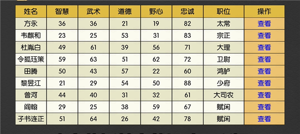 9、点击查看其它官员就可以看见相应的野心,初始都比较低;
