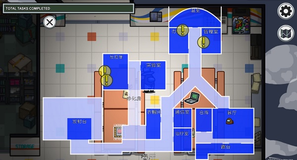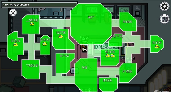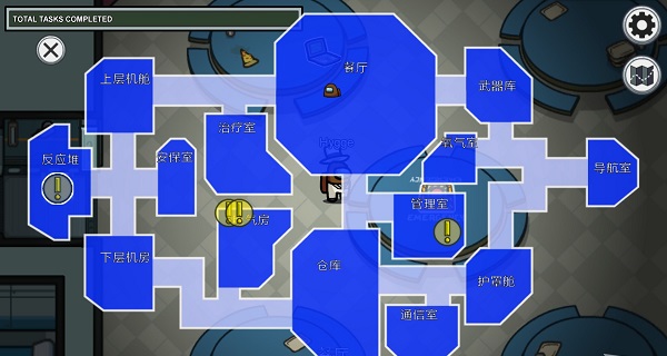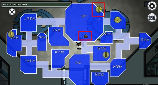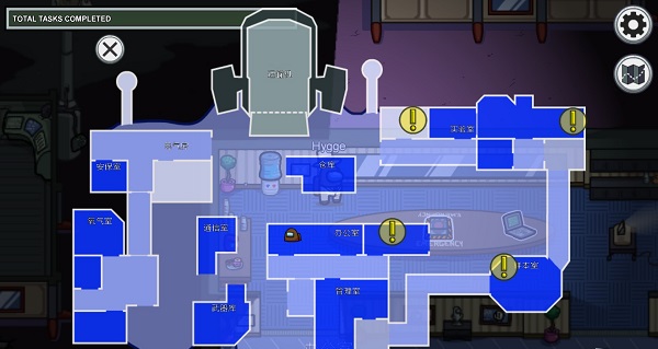右上角为设置按钮和地图功能,地图中的头像代表玩家当前所在位置,叹号则表示好人玩家能够进行的任务位置。