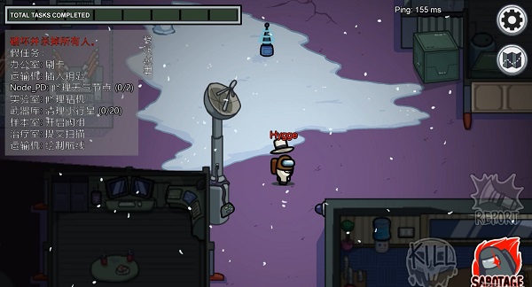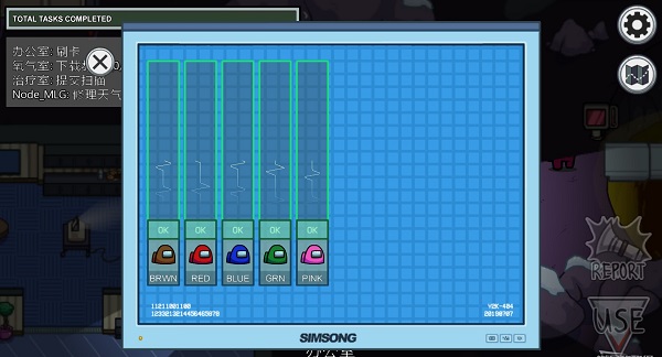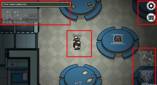 右下角为当前玩家可以进行的操作,好人只能够使用互动完成任务,或者在看见尸体后发动警报。在并没发现尸体但好人识别出内鬼后,可以与房间中央的紧急按钮互动发起会议。