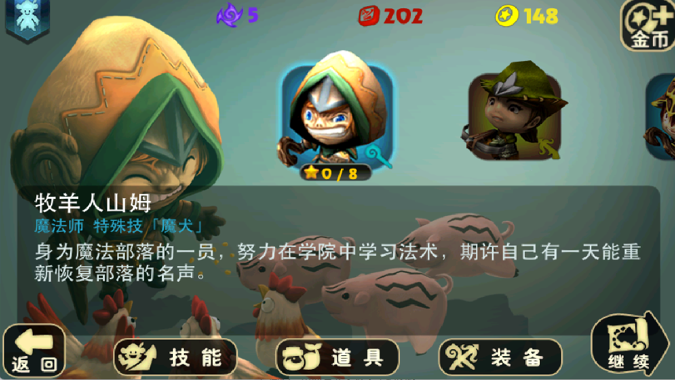 初始可使用魔法师“牧羊人山姆”,其特殊技为“魔犬”,后续可解锁更多角色并通过技能/装备系统强化能力。