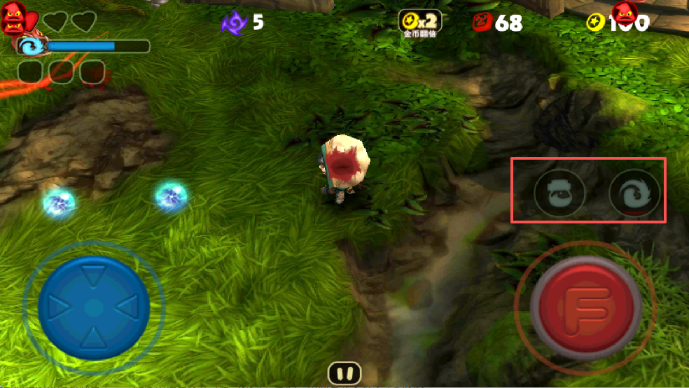 这款游戏采用3D双摇杆操作,左下角的虚拟摇杆控制角色移动,右下角的F按钮是攻击键,游戏支持自动瞄准,你只需控制角色来回移动躲开怪物,按住F按钮不停攻击即可,操作十分简单。