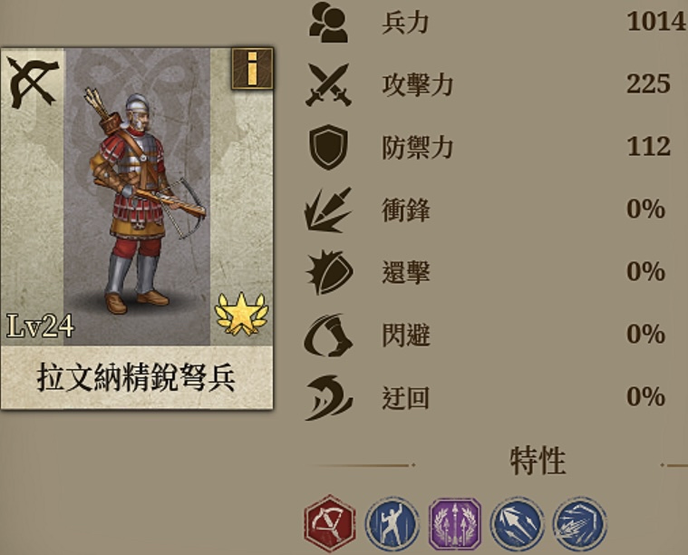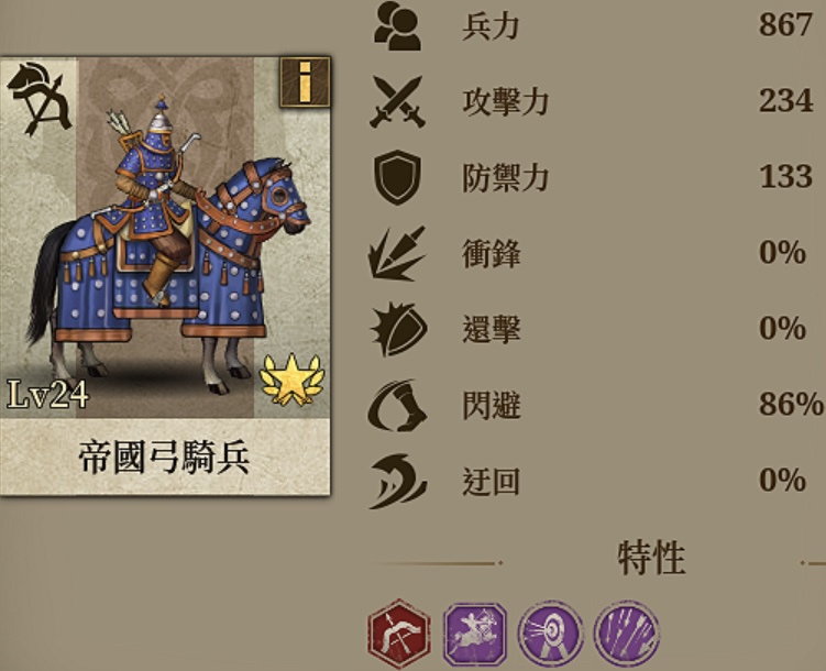 帝国弓骑兵无视闪避以及降低敌方闪避率的特性在噩梦难度战役下能有效地克制敌方的高闪避率。核心兵种,高难度下必带。