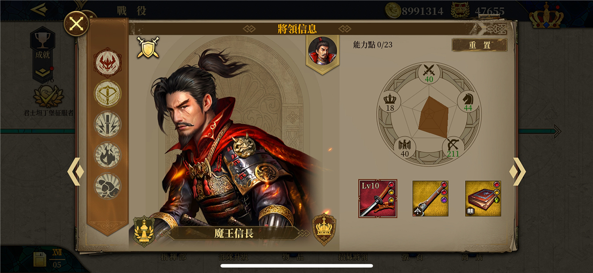 完全体强度尚可,但价格稍贵且目前无法购买。专兵强力,最强山地弓。主动技能效果超模;被动技能组全是加伤,数值给的也很高。开主动后,信长经过的格子都会着火,因此也可以搭配马穆鲁克弓骑兵来提高回合输出上限。同时,信长站火里不会掉血,所以需要搭配贞德提供高昂。想到贞德作为征2的联动将领,其强度低得令人乍舌,其于征2之地位完全不如信长于欧7。