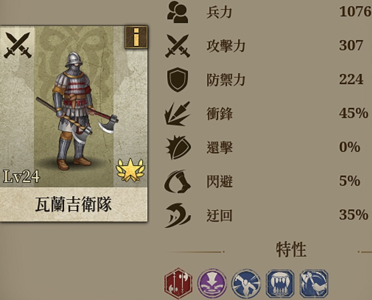 3、瓦兰吉卫队需要根据玩家自身条件自行选择培养与否。虽然其特性在天赋升满的情况下还是一般,但毕竟可以用金币购买,容易培养。如果拥有唐包,请直接培养横刀营。