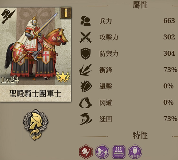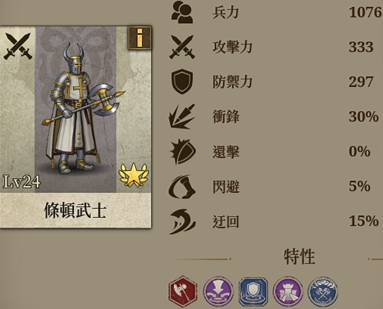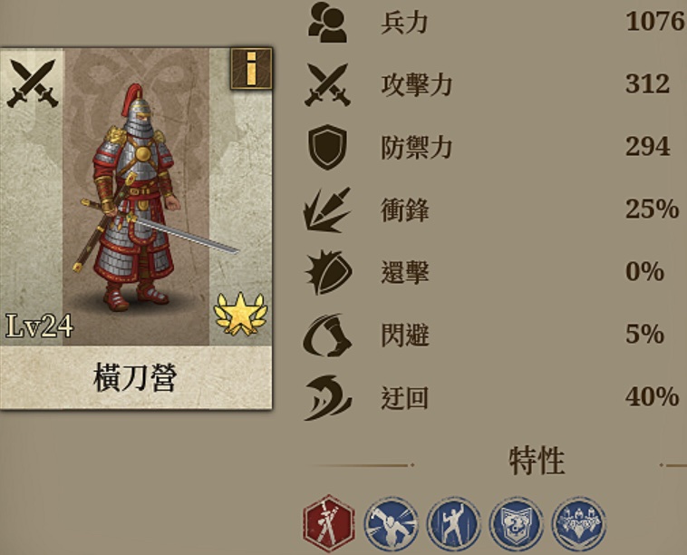 2、横刀营拥有唯一双地形减耗以及高额远程减伤使得其地位居高不下。但自身没有加伤特性,因此本体强度一般。相对容易养成的条顿武士和瓦兰吉卫队在没有唐包的前提下,优先级均比横刀营要高。不要升级5级天赋,浪费资源。