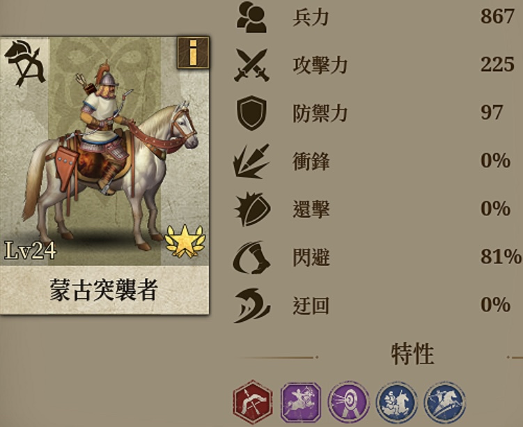 蒙古突袭者拥有攻击减耗以及闪避后增加行动力的高机动性。核心兵种,必养。