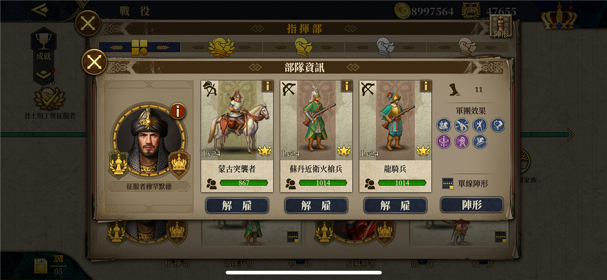 兵种推荐:蒙古突袭者/苏丹近卫火枪兵/龙骑兵。阵型选择单线阵。