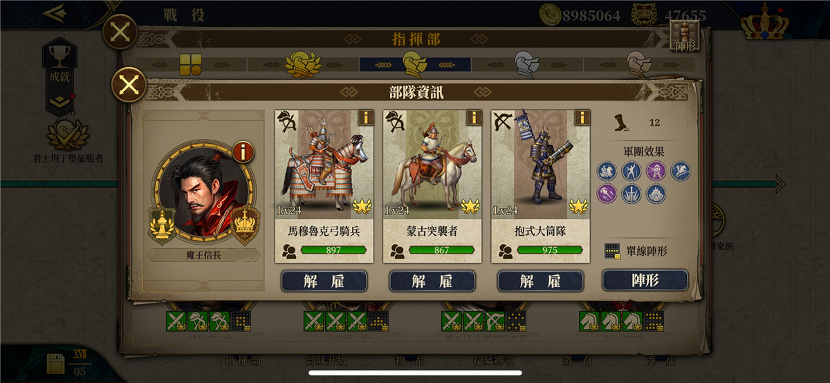弓:马穆鲁克火枪骑兵、马穆鲁克弓骑兵(必备奥托一世和萨拉丁)、蒙古突袭者、抱式大筒(必备织田信长)、苏丹近卫火枪兵(必备穆罕默德二世)、连弩营(必备唐包)、龙骑兵、火矢长弓兵(必备织田信长)、拉文纳精锐弩兵、靛蓝突袭者