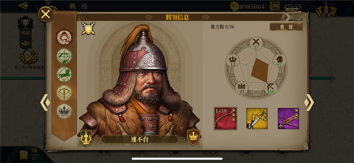 零氪玩家可用的机制将领之一。专兵优秀,但其不稳定性导致无法完全替代怯薛。主动技能有战术意义;被动技能组生存能力很优秀,配合主动技能触发孤军的增伤可以有效弥补稳定加伤不足的缺点。因为零氪拿不到专武,但其初始加点后拥有68点内政能力,后期打挑战征服也可选择将其作为内政蹲城将领。