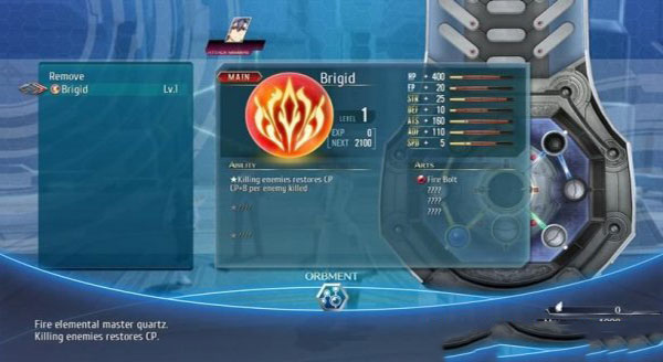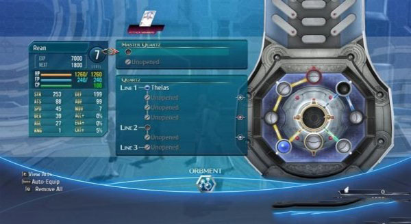 按e后进入菜单可以选择orbment系统,分为arts(魔法)和quartz(魔导器)两部分。