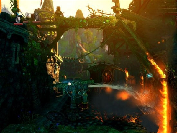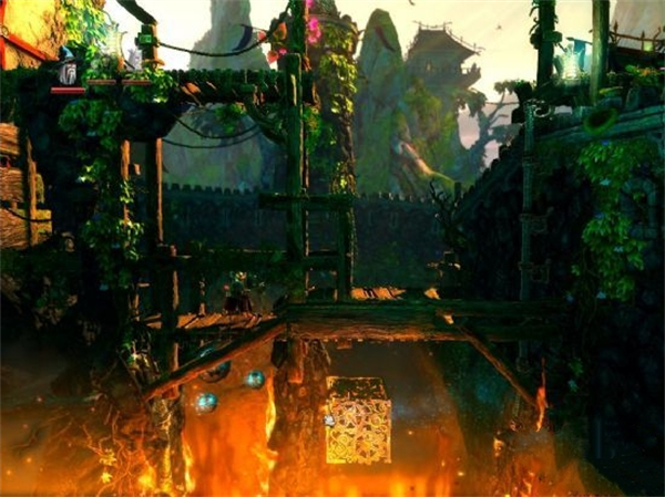 5、之前的铁石不要浪费了,这一场景一共有两个铁石,不用吝啬直接过了场景的第一个坑里丢下去,两个铁石叠在一起下去捡东西的时候就不会被底下的火烧到。然后利用弓箭手的绳索获取下方的药水。木栅栏的障碍可以切换战士用锤头砸碎。另外一边,最底下中间有两瓶药水,先从缺口跳到中间层,然后变成魔法师,随便召唤一个物体,利用物体从最底下靠近火的地方移动过去可以直接将障碍撞开,应该也可以直接用念力操控挡着的木板。失去了阻挡物,在弓箭手跳下火海前用绳索连上第二层的地板,荡秋千的方式就可以取得这里的圣水瓶和药水了。
