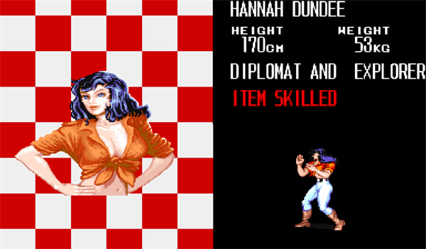 长发披肩,身穿红上衣白裤子。跑动中用盖攻击敌人腹部,跳跃中用脚攻击敌人。绝招是旋风脚。攻击力弱,但是速度快,技能最多,使用武器最好,不擅长对空(对付翼龙和会飞的BOSS得小心了),属于敏捷型;