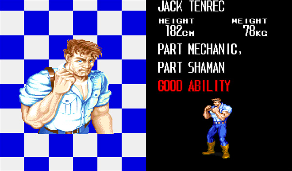 杰克的好友,头戴黄帽,身穿绿上衣黄裤子,童年最火的角色肯定是他。跑动中可以双脚踢人,跳跃中用脚攻击敌人。绝招是翻身腿。实用性最强,速度最快,攻击力也不差,各种攻击尤其是跑动攻击和绝招使其能有效对付空中或地面的敌人。综合能力是四个人最强的。属于敏捷偏平衡型;