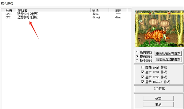 1、解压打开后点击文件载入游戏,随后点击重新扫描所有游戏点击载入恐龙快打。