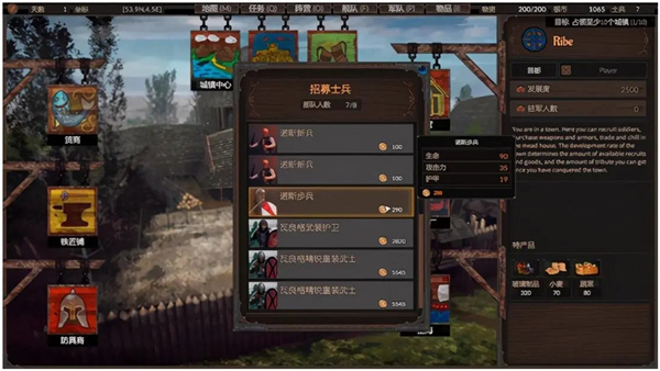 点击新生涯按钮开始游戏,玩家首先映入眼帘的是出生地的主界面,在该界面中,玩家可以看到商铺、铁匠铺、防具商铺等可以购买和交易物品的场所。在兵营里,玩家可以招募各种各样的士兵,根据战斗力和装备的精良程度的差异,玩家需要付出的招募费用也是不同的。