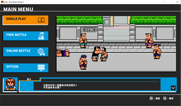街头大乱斗进行曲Mach中文版是一款FC热血系列改编的格斗游戏,同时也是16年PS4《街头大乱斗进行曲》的强化版本。此版本支持简体中文、繁体中文等语言,按键M进入设置-(WASD方向键选择-U建确认)OPTION-Various settings-Set language-Simpified Chinese-按键0返回即可设置游戏为中文语言,亲测有效。 街头大乱斗进行曲Mach游戏讲述各学校接连遭受神秘袭击,为了揭开幕后黑手的真相,国夫带领学校团队参加街头乱斗比赛的故事。玩家可以操控熟悉的热血角色,在街头展开激烈对战。默认拥有30队、每队6名角色,加上隐藏队伍,总人数接近200人。每个角色拥有2-3种必杀技,整体必杀技数量高达250种,技能多样、玩法丰富,欢迎免费下载畅玩!