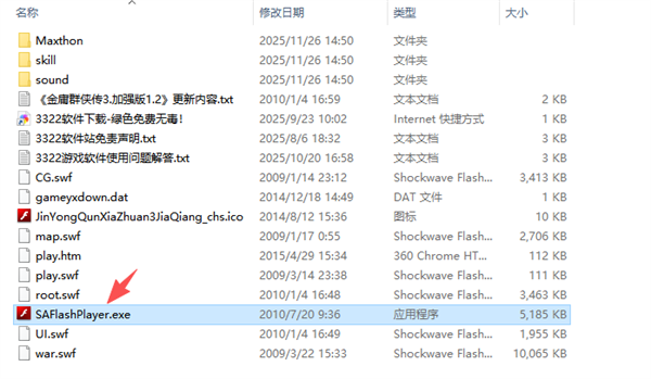 1、解压游戏文件夹后,首选运行SAFlashPlayer.exe;