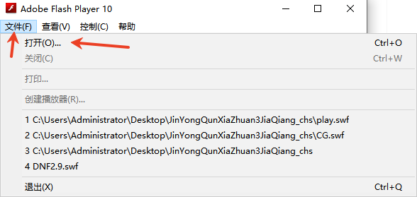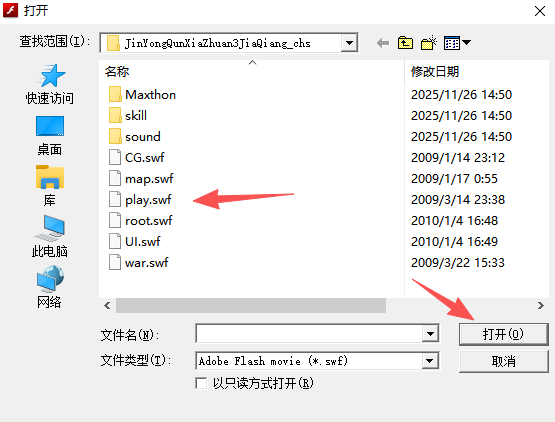 4、选择游戏文件夹所在路径,然后选择play.swf,点击打开;