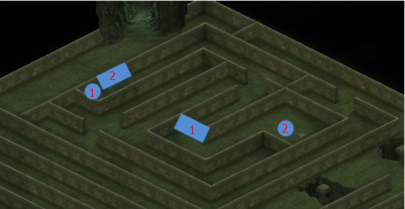 首先走到蓝色圆形标识处,拉下拉杆打开蓝色长方形标识处的门。随后走到红色方形标识处,踩下石板。红色长方形标识1处的门会打开,并且在2处出现通路。