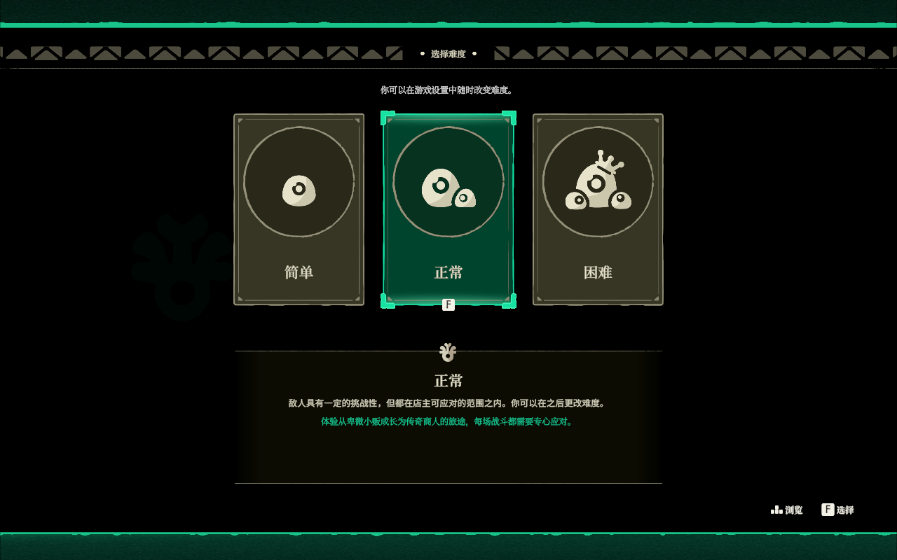 1、游戏开始,玩家可以选择游戏难度,如果想侧重店铺经营可以尝试简单模式,一般而言正常难度就足够了。