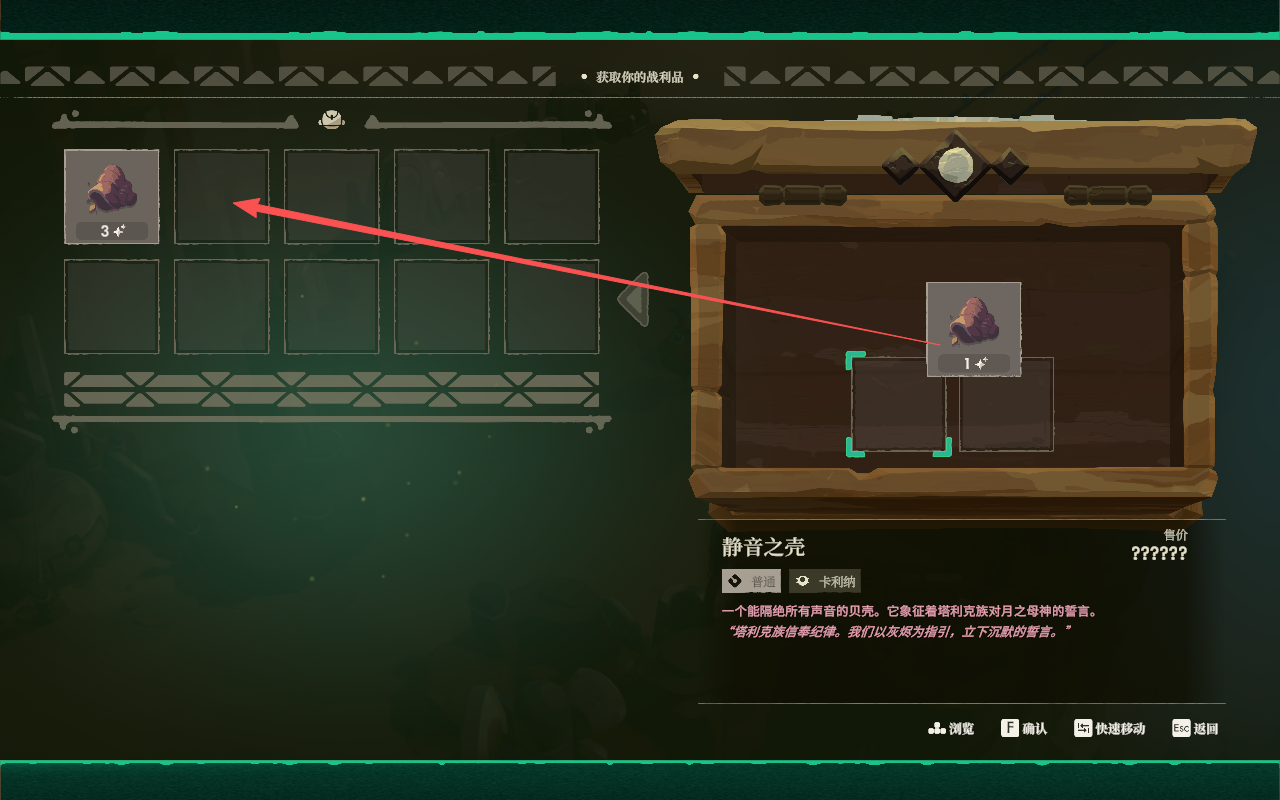 8、经过战斗后,玩家就可以从宝箱中获得遗物了,将右侧宝箱中的遗物移动到左侧的背包就可以了。