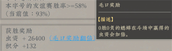 虫资可以利用毛口奖励来获得,0胜0负的蟋蟀如果在斗场中获胜,所得虫资会翻倍。