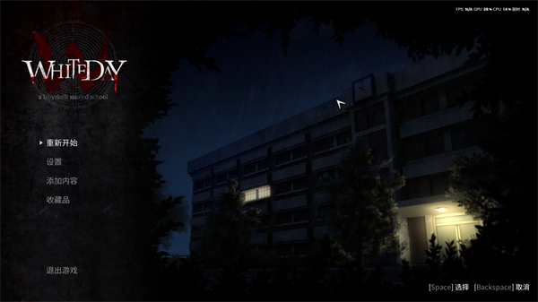 主菜单选项全部在左边,右边则是游戏发生所在校园。选项从上往下依次是开始游戏、设置、添加内容、收藏品和退出。