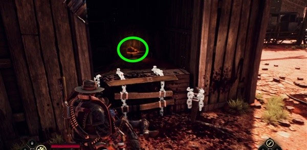 6、继续前进,手推车右侧建筑上挂着一具尸体,用枪把它打下来,拿到30钱。