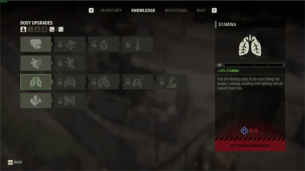 第三行:体力增加,降低近身攻击消耗,降低躲避消耗,加速体力恢复,加速疲惫恢复。
