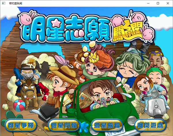 明星志愿闯通关电脑版是一款休闲闯关游戏,它将《明星志愿2》、《明星志愿2000》中出现的人物作为主角,玩家需要选择其中一位的形象进行益智闯关。游戏共设计三种游戏模式,有独自练习的孤星旅程、也有与人机对战的双星闪烁,还有可以获得异能天王称号的群星争辉,每种模式都有其独特的游戏趣味。明星志愿闯通关游戏的各主角以卡通形象登场,每个卡通人物都拥有趣味小动作,如爆炸、被喷水、懊恼、高兴等。快选择你喜爱的明星一起来闯关吧!