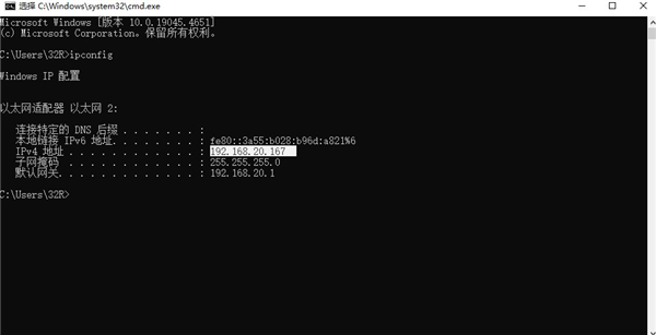 7、接下来输入ipconfig,即可查到需要连机的ip;