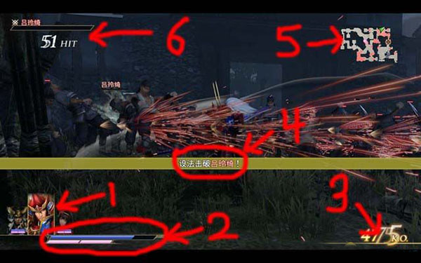 如下图箭头6所指,这里显示的是当前敌人的生命值以及连击次数。