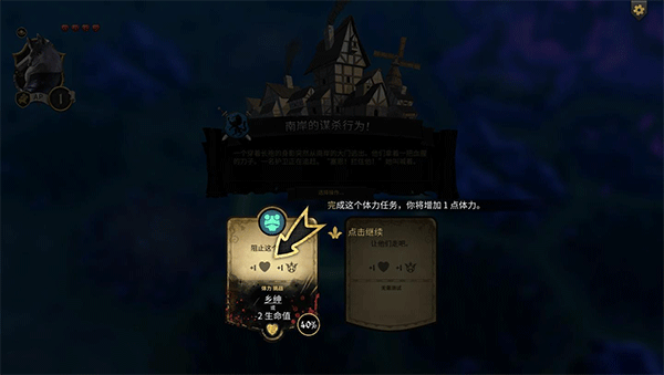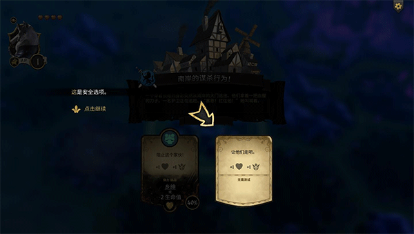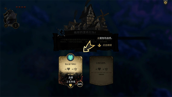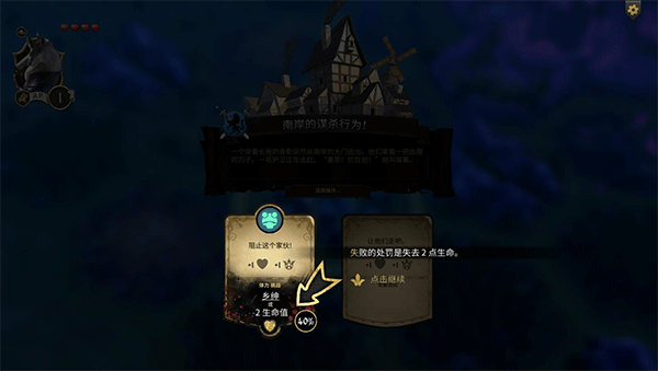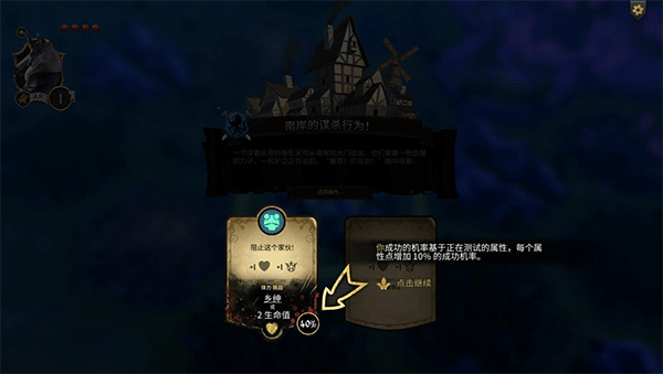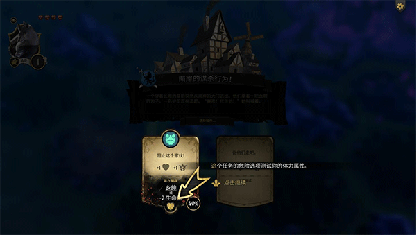 危险完成奖励:在选项下方就能看到奖励,(例下图,如果通过可以获得“乡绅”[追随着],失败会减-2生命值)