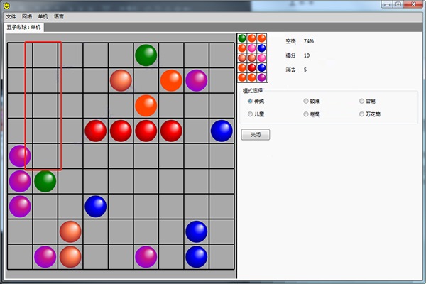 五子彩球连连看电脑版是一款很好玩的休闲益智类游戏。相信很多小伙伴都有玩过这款游戏,它可以很好的帮助用户消磨时间,在空闲时快速来一把,开发智力,提升玩家的反应能力。在游戏中,玩家可以体验多种不同颜色的彩球,每局游戏开始的时候,都会随机摆放位置,玩家每次移动彩球都会随机出现三个彩球,在这个过程中,需要将同样颜色的球链接起来5个就可以消除了,玩法十分有趣,小编是玩不了几次就塞满了,喜欢这类游戏的玩家可以来本站下载该游戏体验一下吧。超级好玩,各种游戏玩法。传统、较难、容易、儿童、卷筒、万花筒等模式,下文中还有简单的玩法教程,大家可以下载这款游戏直接解压无需安装体验一下吧。