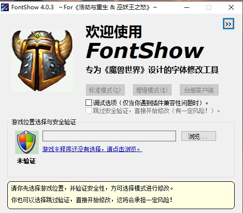 2、运行FontShow,选择游戏位置(默认会读取注册表中的游戏位置),点击开始安全验证。或者勾选“跳过安全验证”,直接开始修改字体。