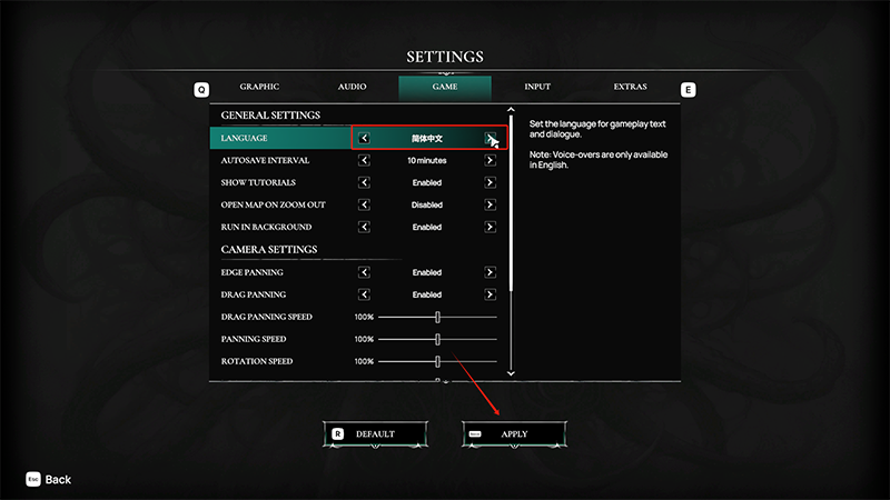 5、找到简体中文后,点击“apply”,然后退出游戏,再重新进入就会变成中文模式