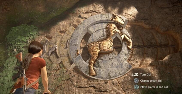 爬到上边后右拐,这里有一个谜题,需要操作机关将墙壁上的图形拼出马的形状。