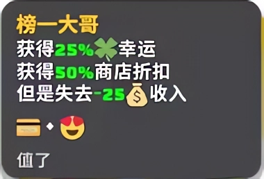 榜一大哥:获得25%幸运,商店打5折,但会失去25收入。
