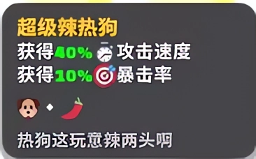 超级辣热狗:获得40%攻击速度,10%暴击率。