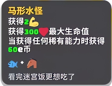 马形水怪:获得2肌肉,300最大生命值,当获得任何稀有能力时获得60e币。