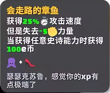 会走路的章鱼:获得25%攻击速度,但会失去5点力量,当获得任意史诗能力时获得100e币。