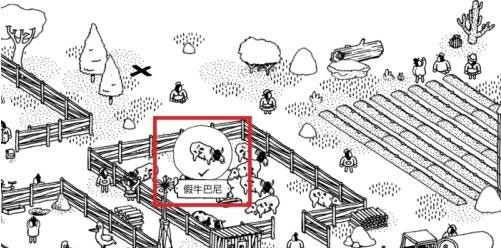 地图右上角的牧场这里,靠近牧场左上角的那头牛就是假牛