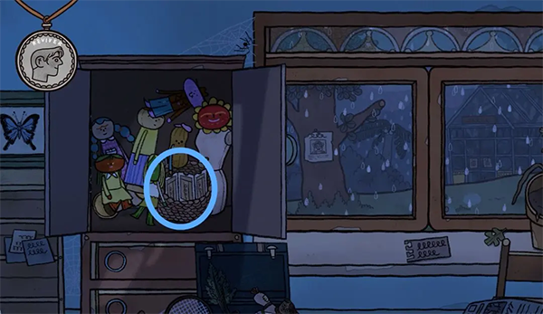 8、转换硬币来到蓝色过去场景,被锁的衣柜上有半张图案标记纸条。