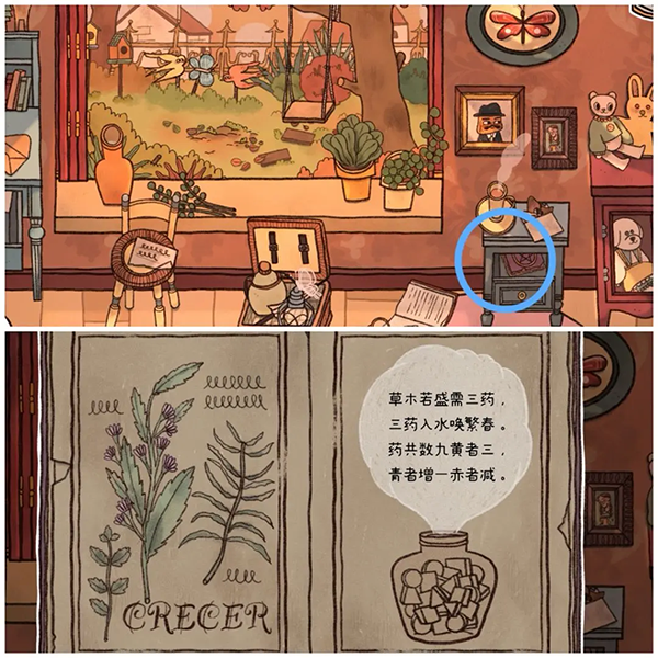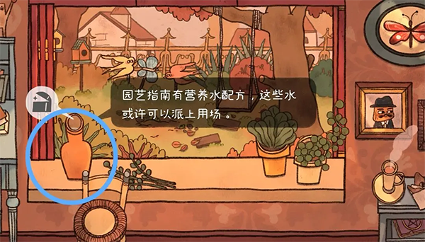 24、点击窗台左边花瓶,有提示说园艺指南有营养水配方,将之前获取的化肥原料放入。