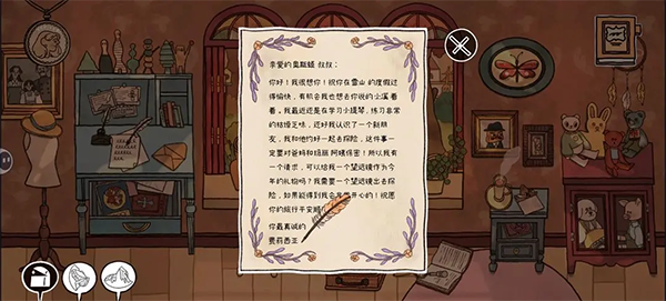 12、先来到蓝色书桌,在桌子上点击信纸点击毛笔给叔叔回信。