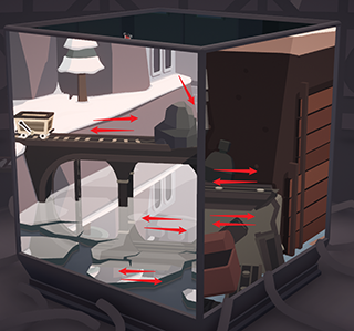 从最开始只要找到形状匹配的物体,到中期加入“时间”要素——船上指南针的旋转和滚动的炮弹关卡——玩家需要关注谜题的时间限制,不能再慢慢来了。个人觉得最精彩的矿车过桥关卡,将更是一场运用“倒影”错觉缔造的盛宴,让人惊叹设计师的天才!