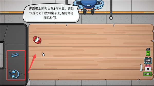 1、进入失物招领模拟器游戏,玩家首先需要将传送带的3件物品摆放到桌子上。
