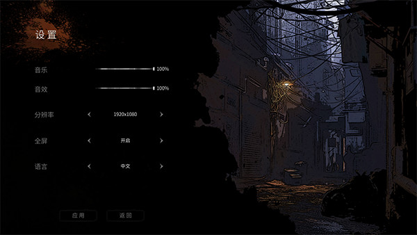 3、设置中除了语言之外,我们还可以对游戏的音乐、音效大小,以及显示分辨率等信息进行自定义设置。
